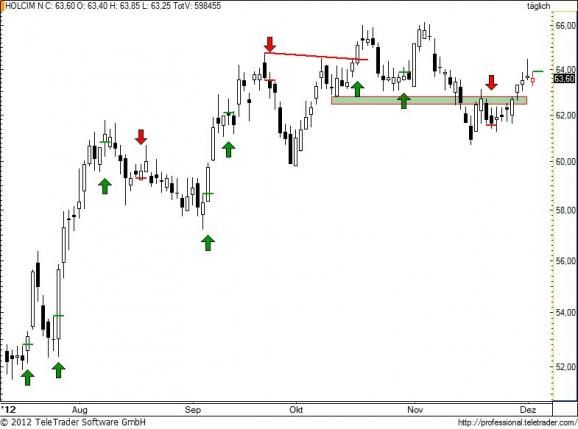 Letztes Update 21.11.12: Nachdem die Unterstützung unter 63 CHF ungenutzt blieb, versucht sich HOLCIM nun auf der Gegenseite. Der Test der gebrochenen Supportzone von unten kann mit der heutigen bearischen Tageskerze als abgeschlossen betrachtet werden, wir legen folgerichtig eine Stop-Sell Order unter das Tagestief auf 61,6 CHF.