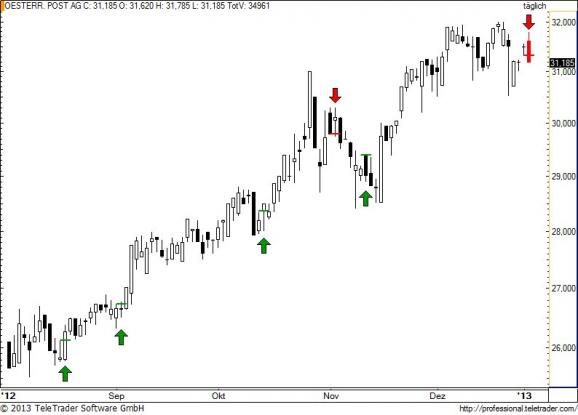 Charttechnischer Ausblick 03.01.13: In den letzten Wochen fanden wir leider keine keine attraktive Gelegenheit für einen günstigen Wiedereinstieg in den Aufwärtstrend der ÖST. POST. Umso mehr erhoffen wir uns für das heutige Verkaufsignal. Die Aktie hat am 19. Dezember eine Bullenfalle, und in Folge des Rückfalls ein tieferes Zwischentief produziert. Seit die Gegenbewegung läuft warten wir auf eine günstige Einstiegsglegenheit, der Doji von Mittwoch kam da gerade recht. Unser Ziel liegt bei 30?.