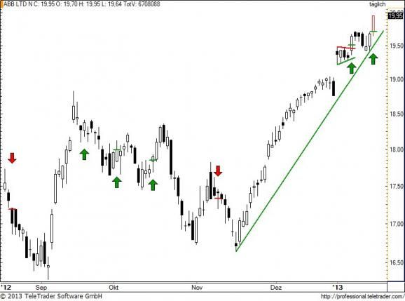 Charttechnischer Ausblick 17.01.13: Applaus Applaus, endlich schiebt ABB die zaudernden Hände aus dem Geschäft. Blieb der erste Ausbruch am 9. Januar noch folgenlos, so erwarten wir uns nach heute wesentlich mehr Dynamik gen Norden. Denn das formelle Kursziel liegt bei 20,75 CHF, das ist schon noch ein schönes Stück. Sollten die Bullen in eine Falle laufen, verabschieden wir uns ab 19,7 CHF wieder aus der Position. Rühren aber frühestens ab 19,5 wieder bearische Investments an.