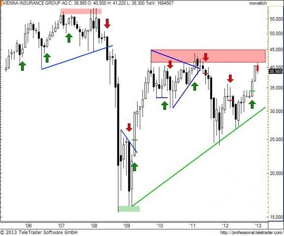 Letztes Update 28.02.11: Mit dem aktuellen Longeinstieg gewinnen wir zwar keinen Schönheitspreis, denn seit den Tiefs hat VIENNA INSURANCE GROUP bereits ansehnlich zugelegt. Aber in der Seitwärtsphase seit Oktober 2009 sind wir einfach zurückhaltend geworden. Erst der aktuelle Ausbruch im langfristigen Monatschart riecht nach Rallye, Ziel 55?. Sollte das Ganze eine Bullenfalle sein, spekulieren wir unter 39? auf mindestens 32? dann.