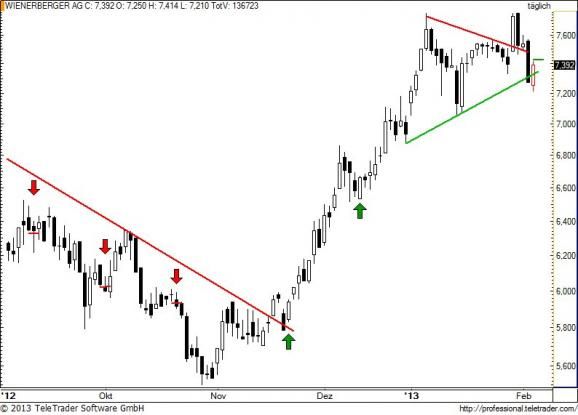 Charttechnischer Ausblick 05.02.13: Wer den Mut aufbringt, findet in WIENERBERGER nach heute eine aggressive Longchance im Tageschart. Denn der gestrige Schlusskurs unter der alten Begrenzung des zulaufenden Keils stellte sich heute als Bärenfalle heraus. Eine Stop-Buy Order über dem Tageshoch verspricht ein rasches Erreichen des Jahreshochs unter 7,72?. Und es kann ja schließlich auch darüber hinaus gehen. Das heutige Tagestief von 7,2 darf aber nicht mehr unterschritten werden, sonst ist dieses Szenario hinüber.