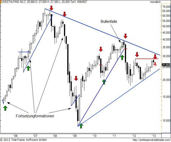 Letztes Update 01.08.12: Langsam wittern die Bullen wieder ihre Chance. Bis vor kurzem sprach im langfristigen Monatschart noch alles für die Gegenseite, hatte VOESTALPINE ein Kursziel von 15? zu fürchten heuer noch. Doch die unterwartete Stabilisierung über 20? gelang, die zweite zögerlich bullische Monatskerze in Folge ermöglicht eine Kauforder ab 23,15? mit Ziel 37?.