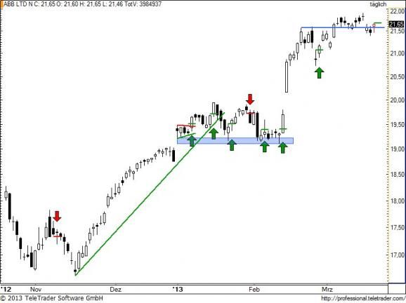 Charttechnischer Ausblick 20.03.13: Man erkennt schön auf den ersten Blick, wie wichtig für ABB diese Zone über 21,5 CHF war und noch immer ist. Nach mittlerweile zwölf unvolatilen Handelstagen um diese Linie herum denken wir, dass nach dem heutigen Hammer die Zeit für neue Käufe gekommen ist. Ab dem Tageshoch bei 21,65 CHF spekulieren wir auf Anschlusskäufe mit Ziel 22,5 und 23 CHF. Der Stopp kann ohnehin sehr eng auf 21,35 CHF gelegt werden. Das ergibt angenehme Chance-Risiko-Verhältnisse.