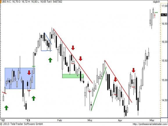 Charttechnischer Ausblick 06.05.13: Günstig ist natürlich was anderes, aber in so steilen Aufwärtstrends muss man selbst die zartesten Korrekturen schon für bullische Wiedereinstiege nutzen. UBS hat im kurzfristigen Tageschart eine beeindruckende Rallye von fast 20% aufs Parkett gelegt. Und da dies noch nicht das Ende der Fahnenstange sein muss, nutzen wir die heutige kleine bullische Tageskerze für eine Stop-Sell Order über dem leicht korrigierten Tageshoch von 16,8 CHF. Denn nach dem praktisch mühelos errungenen neuen Jahreshoch stehen der Aktie alle Tore bis 20 CHF offen. Da reden wir aber schon vom mittel- bis langfristigen Ausblick, im Tageschart sollte das einfach noch viele weitere bullische Fortsetzungssignale zu bedeuten haben.