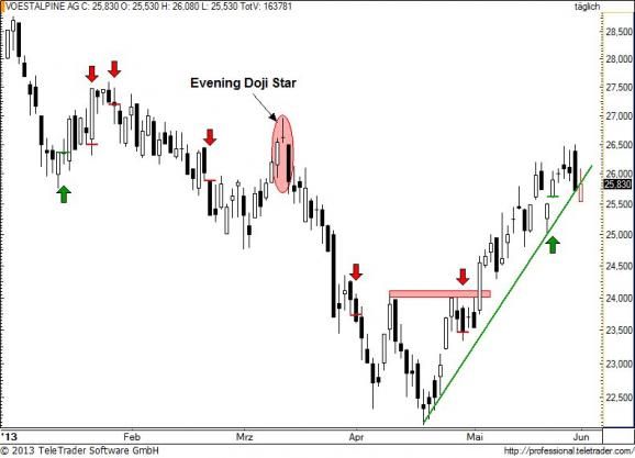 Charttechnischer Ausblick 03.06.13: Zur Eröffnung heute hat VOESTALPINE die Investoren gleich mal aufgeschreckt. Das war dann aber auch der Tagestiefstkurs, in Folge kannte der Kurs nur noch die Richtung nach Norden. Damit wurde der Aufwärtstrend zwar noch nicht zur Gänze zurückerobert. Das Tageshoch lag aber jedenfalls wieder in sicheren Gewässern. Und genau hier zu 26,1? legen wir auch unsere nächste Stop-Buy Order, um auf eine Fortsetzung in Richtung 27,5? zu spekulieren. Gefährlich wird es für diese Aktie unter 25,5?, dann droht eine neue Baisse mit Ziel 24 und 22?.