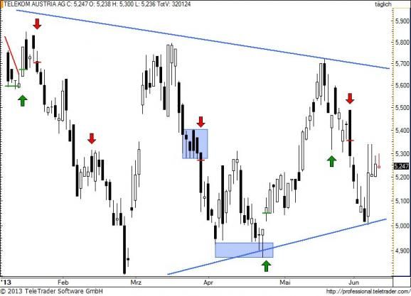 Charttechnischer Ausblick 12.06.13: Die Erholung der letzten Tage mag ja ganz schön anzusehen sein. Doch ist diese bisher nichts weiter als ein Tropfen auf dem heißen Stein. Charttechnisch bahnt sich bisher einfach nur die nächste bearische Fortsetzungsformation an mit Ziel 4,9?. Davor wird allerdings noch der Aufwärtstrend um 5? ein Wörtchen mitzureden haben. Aber dort kann der Stopp dann ja bereits in den Gewinn nachgezogen werden. Als Einstieg eignet sich das heutige Tagestief bei 5,23?. Oder man wartet noch eine kleine negative Tageskerze ab, welche ja in der Regel der Startschuss einer neuen Abwärtsbewegung ist.