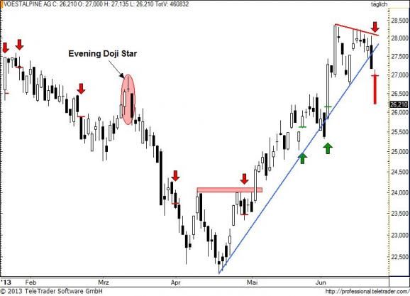 Charttechnischer Ausblick 24.06.13: Heute reißt es selbst die bisherigen Musterkandidaten in die Tiefe. So auch VOESTALPINE, im Tageschart ist der schöne Aufwärtstrend hinüber. Damit schreit nun der Bereich um 24? danach angetestet zu werden. Unterstützung erhalten die Bären auch vom übergeordneten Wochenchart. Dort hat sich der Widerstand um 28,5? erneut als zu stark erwiesen, dort sind gar 22? das Ziel.