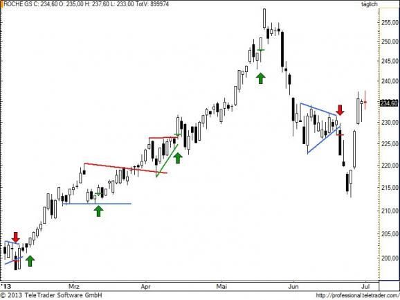Letztes Update 04.06.13: Am 28. Mai waren wir zu feige für einen aggressiven Shortversucht, zu beeindruckend war der stabile Aufwärtstrend. um 230 CHF hat sich ROCHE nun wieder gefasst, und ist drauf und dran diese gesunde Korrektur für einen neuen Angriff auf 255 CHF zu nutzen. Das heutige Piercing Pattern bedeutet für uns jedenfalls eine Stop-Buy Order über das Tageshoch bei 234,5 CHF zu legen mit dem genannten Ziel. Der Stopp auf 228 CHF ergibt ein attraktives Chance-Risiko-Verhältnis von 3,15.