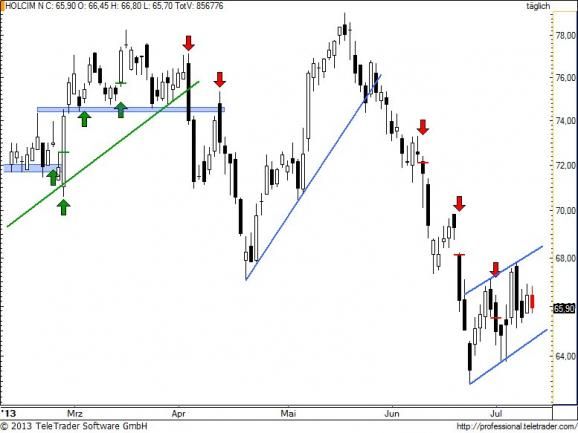 Charttechnischer Ausblick 11.07.13: Aus dem jüngsten Verkaufsimpuls vom 28. Juni wurde zwar nichts, aber trotzdem ist HOLCIM noch nicht aus dem Schneider. Im Gegenteil, statt einer kleinen arbeitet der Chart nun an einer riesigen bearischen Flagge. Diese hat für sich alleine schon ein Kursziel von 60-61 CHF. Viel schwerer wiegt aber die Möglichkeit, dass diese aktuelle Konsolidierung genau die Hälfte des Abwärtstrends markiert. Dann nämlich würden wir die Aktie formell im Laufe des Jahres um 48 CHF herum wiedersehen...