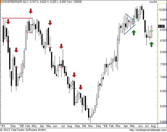 Charttechnischer Ausblick 27.07.13: Nach fast 100% Kurszuwachs seit dem Novembertief des Vorjahres hat sich WIENERBERGER eine Atempause redlich verdient gehabt. Diese jüngste Korrektur im Ausmaß von fast 20% hat die Aktie im mittelfristigen Wochenchart auf ein neues günstiges Kaufniveau zurückgeführt. Diese Chance in Form der beiden kleinen bullischen Vorgängerdojis wurde diese Woche auch just genutzt. Anschlusskäufe sollten nun rasch wieder zu Kursen > 10? führen können. Brandgefährlich wird es hingegen wenn sich ein tieferes Hoch oder ein Doppeltopp abzuzeichnen beginnt. Dann muss man bereit sein sich rasch auf die andere Seite zu begeben.