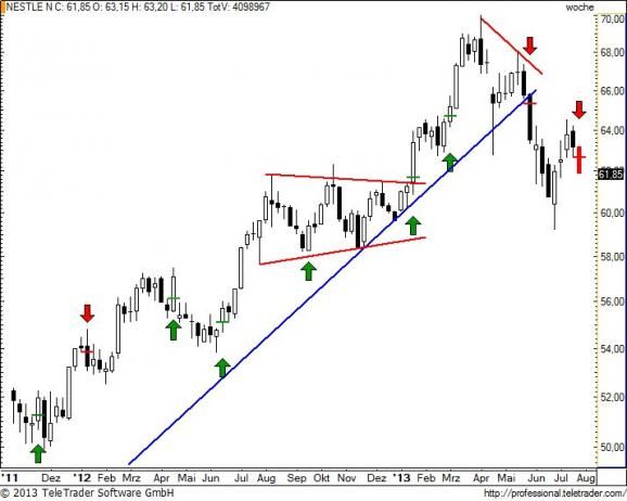 Charttechnischer Ausblick 27.07.13: Nach dem ersten Abwärtssog, der dem Bruch des Aufwärtstrends Anfang Juni folgte, setzte eine gesunde Gegenbewegung ein. Die NESTLE im mittelfristigen Wochenchart wieder um 5 CHF höher hiervte. Dort bildete sich letzte Woche eine schöne Dark Cloud Cover, das Signal für die Bären auf eine Fortsetzung der frischen Baisse zu setzen. Die Anschlussverkäufer ließen sich denn auch nicht lange bitten, die Ziele lauten nun 58 und 56 CHF.