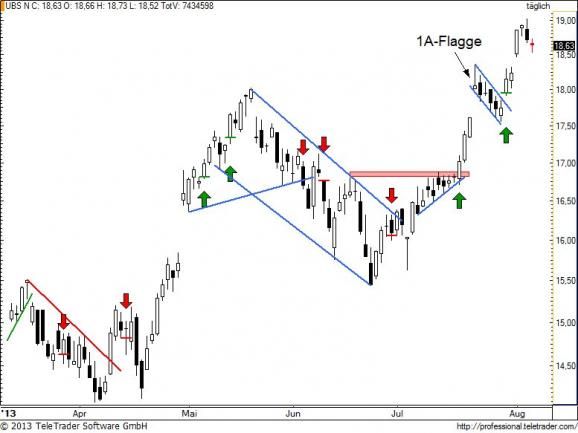Letztes Update 17.07.13: Sieh einer an, UBS konnte doch tatsächlich das drohende Unheil in Form einer riesigen bearischen Flagge abwenden. Nach einigen kniffligen Handelstagen auf der Kippe schafft die Aktie heute dynamisch den Schlusskurs auf einem neuen Zwischenhoch. Das verspricht Anschlusskäufe mit Ziel 18 CHF, auch in den übergeordneten Zeitfenstern sieht der Chart dadurch gleich wieder viel freundlicher aus. Sämtliche kurzfristigen Rücksetzer sind damit künftig Kaufkurse.