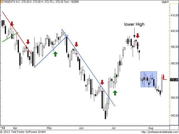 Letztes Update 07.08.13: Das sieht nicht mehr wirklich gesund aus. Tagelang schon kämpft SYNGENTA im Tageschart um eine Bodenbildung um 370 CHF, der Kampf endet scheinbar zugunsten der Bären. Noch liegt um 366 CHF ein letzter seidener Faden, darunter muss man sich aber sofort in Richtung 350 CHF orientieren. Wohingegen ab 375 CHF die Bullen zurück im Spiel wären, mit Ziel 395 CHF dann.